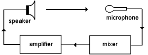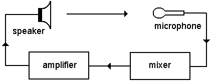 As in the the diagram below, accidental or inattentive feedback, happens when a microphone feeds a signal to be mixed ahead of an amplifier, which channels the sound into a speaker, which broadcasts the sound, which is again picked up by the originating mic to feed back the sound as a loop.