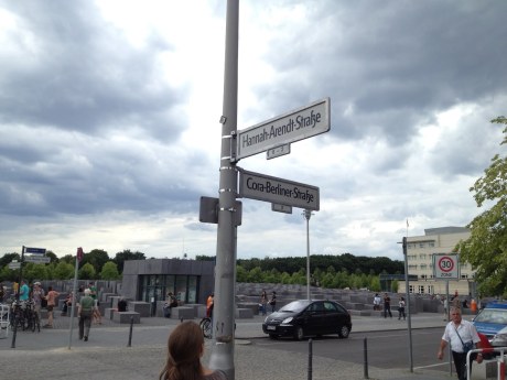Eventually we drifted away from the memorial. As we walked away, I noticed that the memorial-bordering street we were walking on was called Hannah-Arendt Straße. Hannah Arendt – who survived the Holocaust and became a philosopher famous for examining the conditions under which the Holocaust was made possible in EichmanninJerusalem – has a street named after her bordering the Holocaust memorial. At first glance, this makes a great deal of sense, given the broad topic of her research, but at least in my interpretation, it appeared to be an oxymoron.