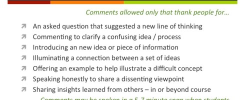 In playing with ideas from the Stephen Brookfield and Stephen Preskill book on teaching with discussion, I began to formalize ways of incorporating silence into class sessions – for reflection, for catching up a bit, for listening to what isn’t and is almost said, for hearing subjects and authors in addition to (even before) our own ideas.