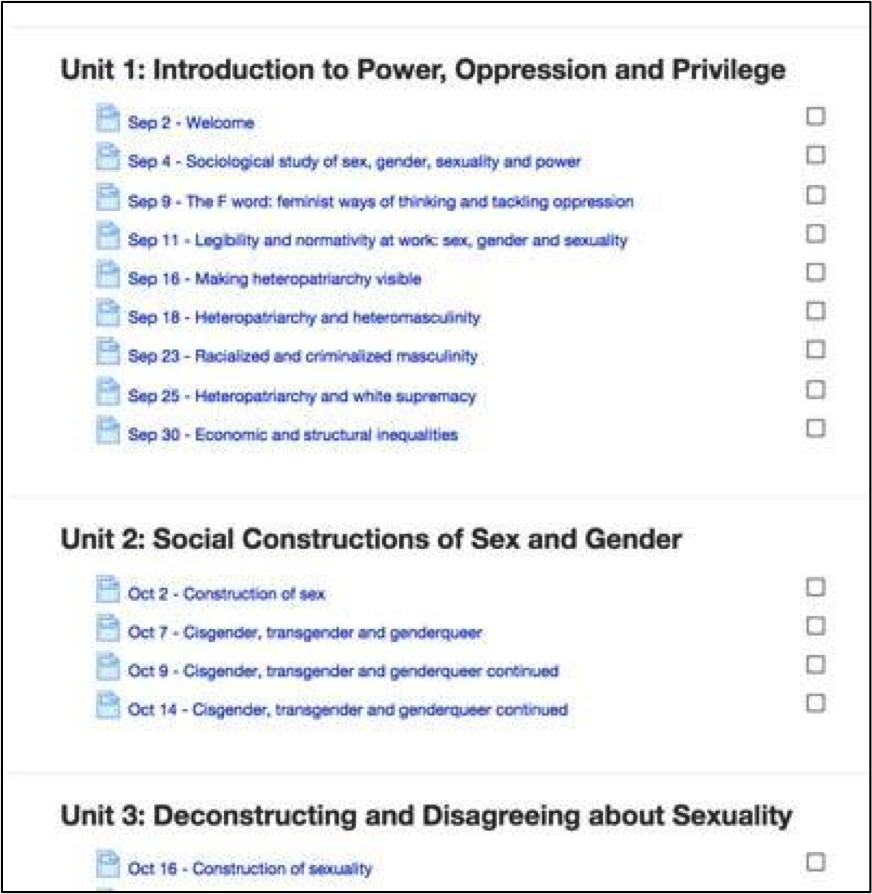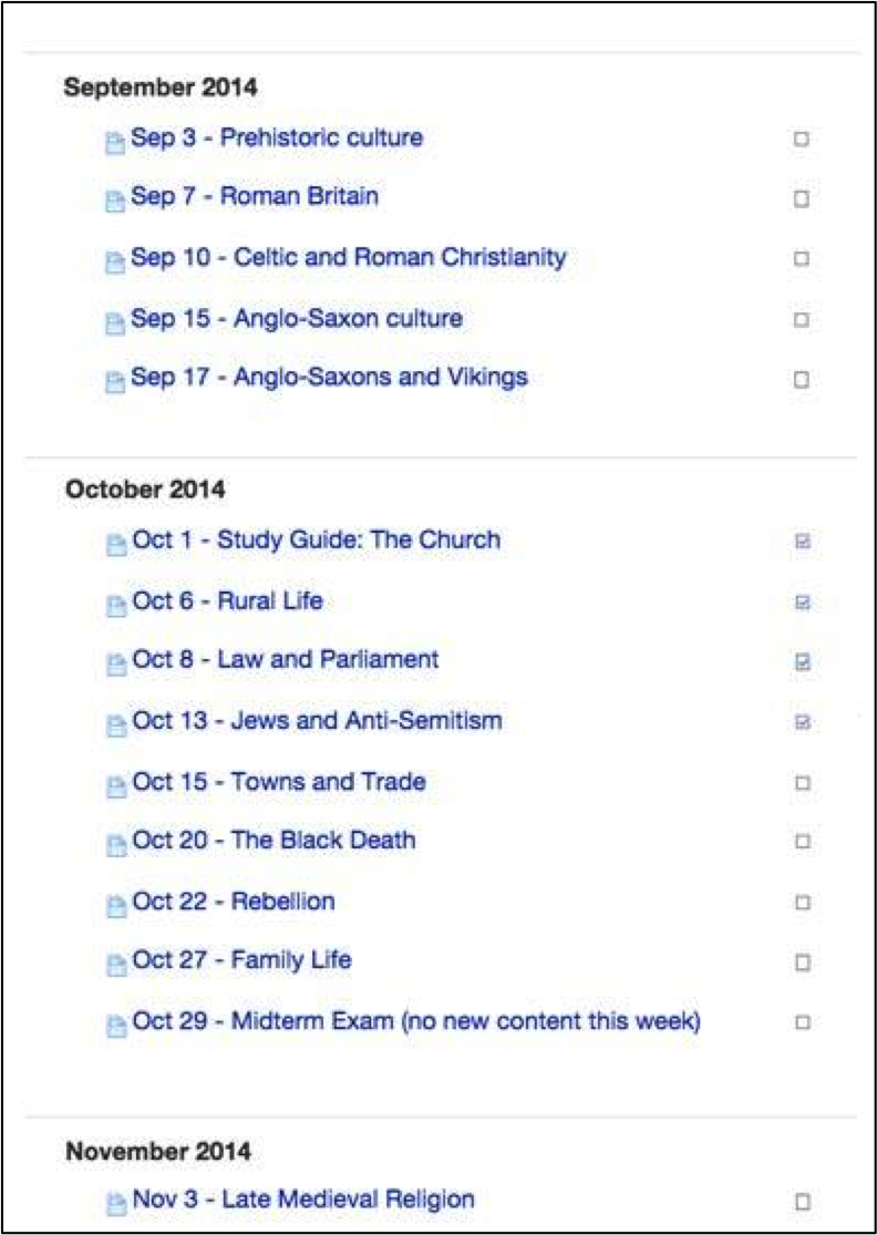 Note that in both cases, the content has been organized below the headers in a series of content pages (in Moodle, just “Pages”) by date of F2F class session. Similar to a table of contents, the student can see the layout of an entire semester without experiencing the “scroll of death” for which Moodle is so often criticized. And relocating content from the course homepage into content pages preserves a clean and manageable look and feel on the course homepage.