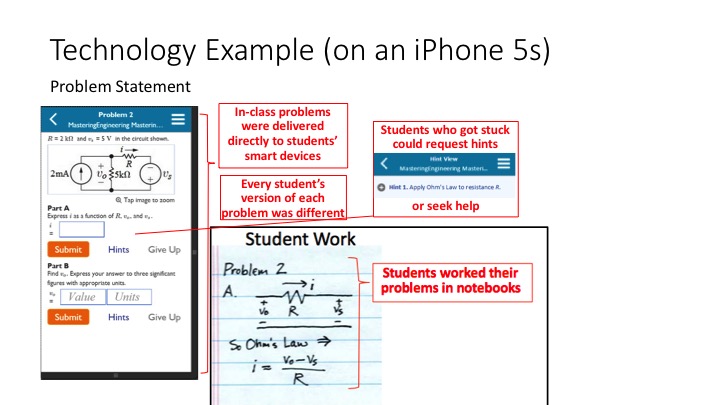 The particularly salient takeaway, Kris notes, is how Mark manages giving feedback and keeping students on task in class: “He’s using the homework system, MasteringEngineering, for administering the in-class activities. He sets up a “homework” assignment that becomes available a few minutes after class starts and closes a few minutes after class ends. Students use their laptops or mobile devices to log-in. They can make multiple attempts and get instant feedback (and no additional grading for the TAs). The system can robustly accept numerical and algebraic answers.” The image below showcases some of the features of this online problem statement, which are fully set out in the slideset: