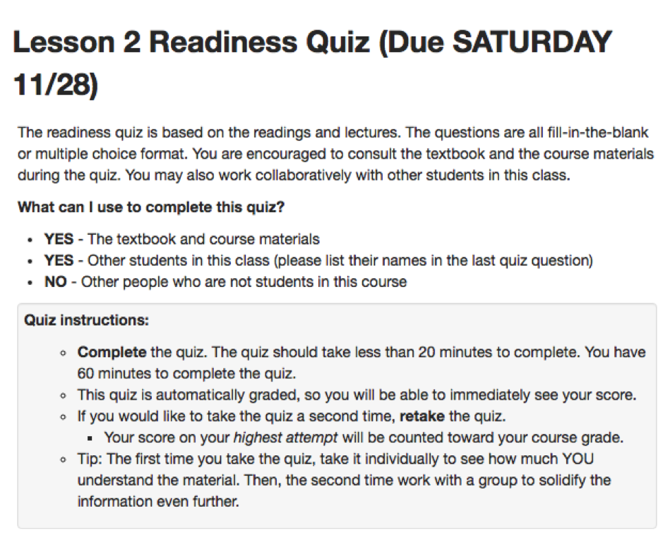 We tested two versions of quiz and assignment instructions. One was very detailed and spelled out what students could and could not use, as well as detailed information about how to complete the assignment or quiz. The other was a block of text telling students a fairly minimal amount of information. The detailed information, set out in the example below, was the preferred style.