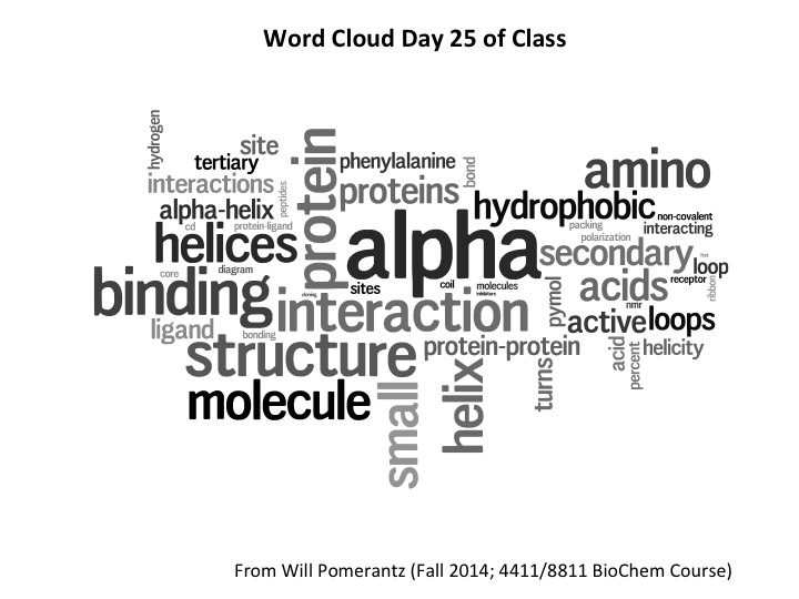 On viewing the image, the BioChemistry students were prompted  to list as many words as they could in response to a diagram.  As a follow up, the instructor created word clouds with their responses – at the start of the term, and again as students re-viewed and responded anew in writing to the image.