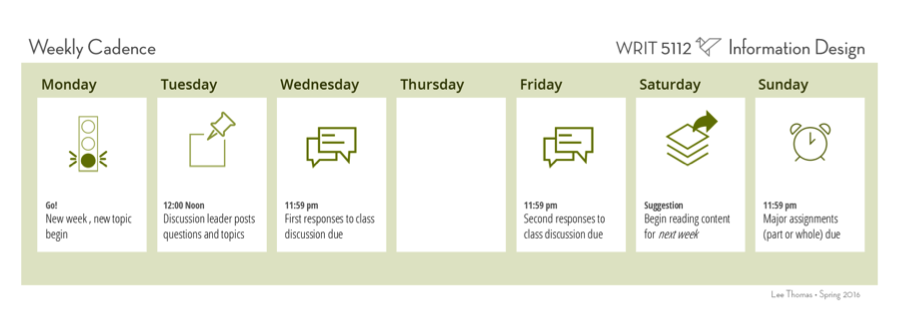 Cadence as an Image: Each of these was created for courses taught by UMinnesota Writing Studies faculty –  Ann Hill Duin and Lee Thomas to serve as an introduction to the weekly flow of the course, and as a quick glance checklist students could consult throughout the course.