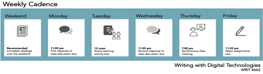 Online courses that link teaching, learning, assignments, and assessments to work that happens within online discussion forums require regular, sustained participation in patterns that we need to overtly introduce to our students.  We can do this by developing a cadence for a typical module or unit in the course, and then sharing this recommended or required module flow and participation pace setting with students in verbal and/or visual ways. Setting out a weekly cadence, or general pattern for/sequence of activities within the course guides students in learning “how to” prepare for and participate in your course. The cadence can be especially important for online courses requiring students to interact within modules, to move through an online course as a synchronous cohort rather than primarily individual, didactic learners, and/or for classes that incorporate out-of-class components, such as service learning, field or internship components with time-sensitive requirements.