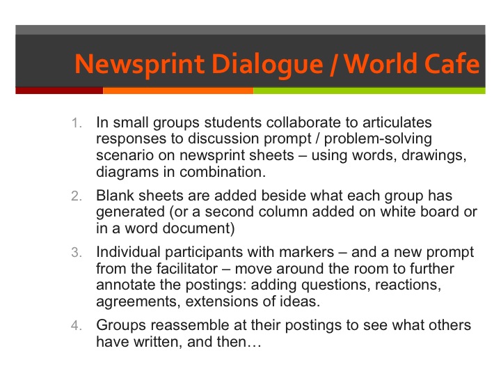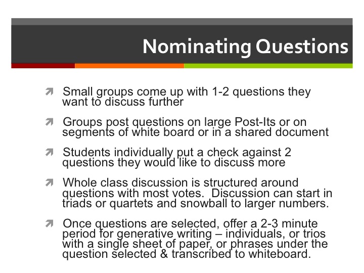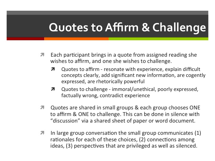 One further note before turning the post over to the slides, the ideas in these merged slides – colleagues and former Teaching in Higher Education students have taken this mingling of my teaching practice with Brookfield’s original work I’ve done in classrooms across 25 years – into their own classes out across the curriculum: They’ve made adaptations of these ideas in their math, engineering, nursing, horticulture, philosophy, art, studio, music and literature classrooms. Here’s hoping you will find ways to do the same in creating discussions that spark thinking and idea shaping with quiet and collaboration in speaking.